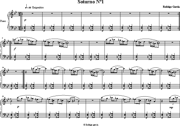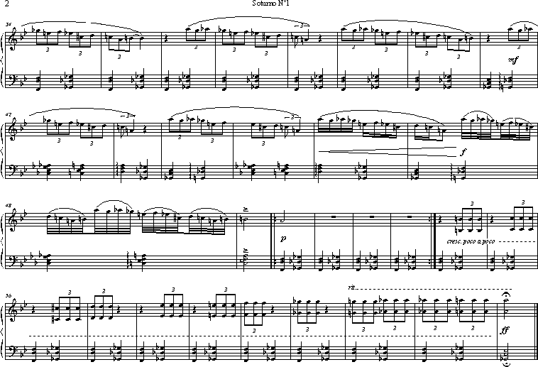 Obs: As alturas constitutivas e a ordem das notas do motivo foram preservadas, salvo uma única exceção (a codetta comps. 54-64), onde ocorre uma total desfiguração do motivo. Para acompanhar a melodia variada, foi elaborado um ostinato composto por dois acordes si bemol maior e sol bemol maior. Observe-se que a nota si bemol não é tocada na melodia e no ostinato (esta mesma nota é comum aos dois acordes). O segundo objetivo foi tentar ressaltar a existência de uma nota que nunca é ouvida, mesmo que isto ocorra em grau de subconsciência. Ainda no último compasso da peça, foi harmonizada a nota lá (sensível de si bemol) como o acorde se sétima da sensível da tonalidade de si bemol menor. A tendência é de se ouvir a resolução esperada, mesmo que ela não ocorra.
