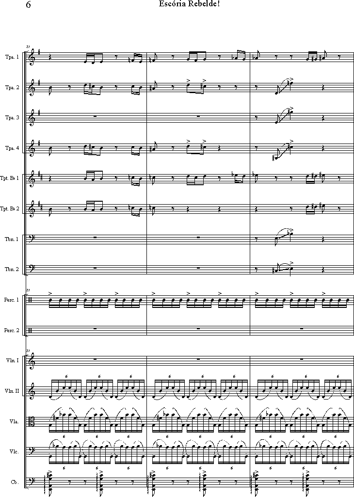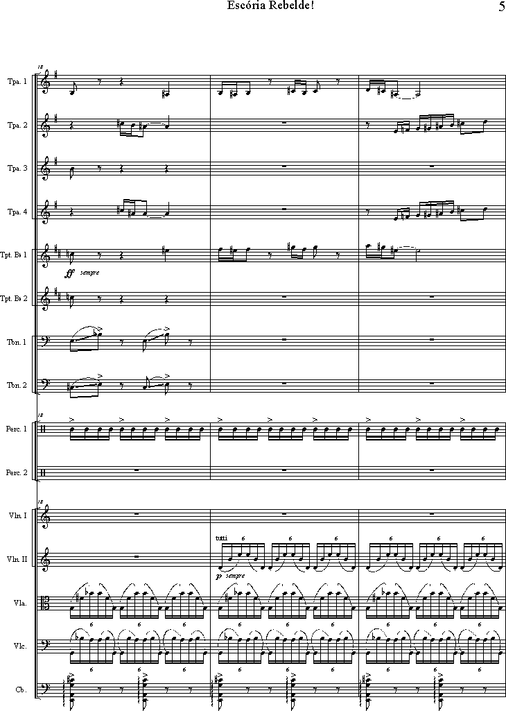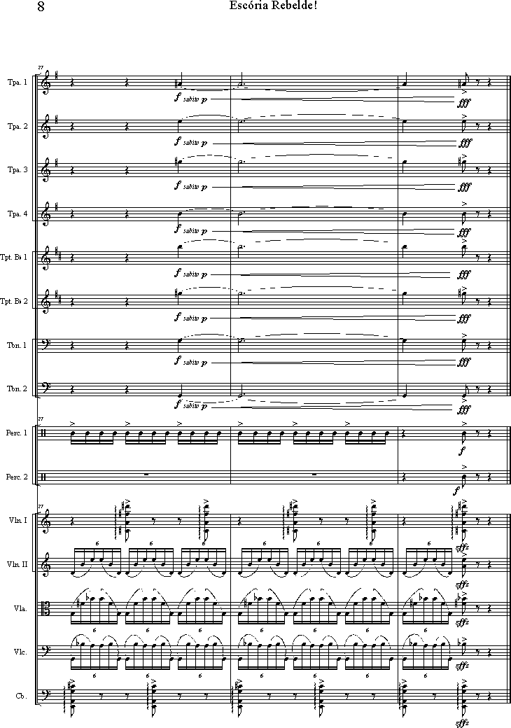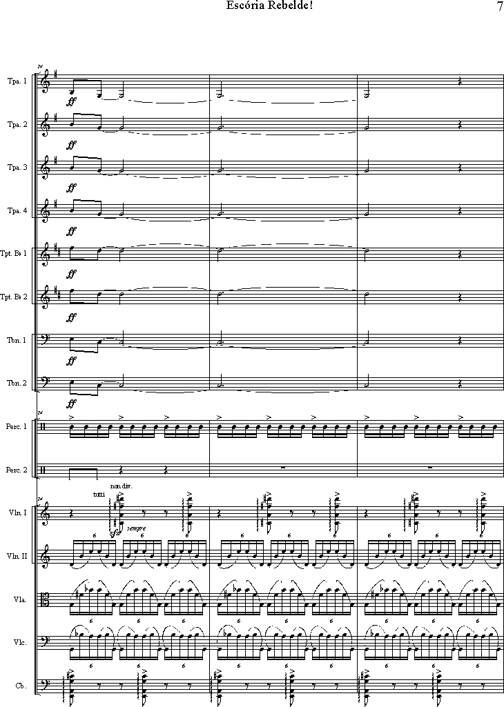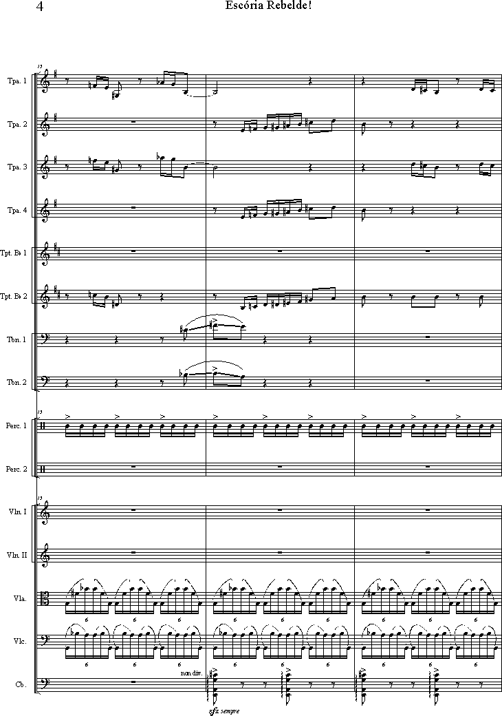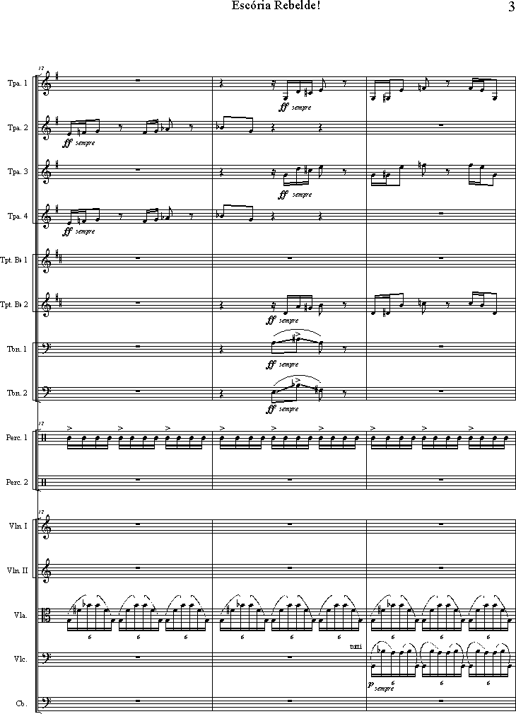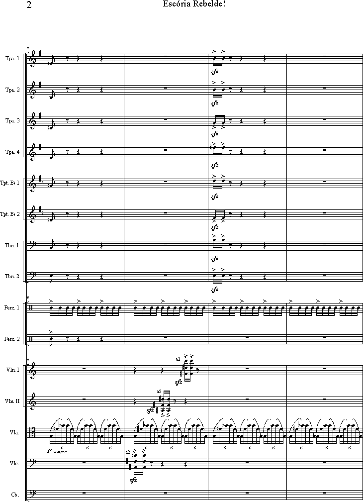 Este preceito define que eventos semelhantes por cor, odor, peso, intensidade, tamanho e forma se agruparão entre si. Em Escória Rebelde!, pequena peça para octeto de metais, percussão e orquestra de cordas, restou feita opção pela demonstração desse princípio valendo-se das relações existentes entre determinados planos tímbricos. As cordas constituem o acompanhamento que é realizado por meio de um ostinato (comp. 8 em diante). Apesar da sensação de movimento, ocasionada pelo uso de arpejos em andamento allegro, a linearidade do tratamento aplicado à figuração dessa seção atribui-lhe um caráter estático. Pode-se dizer que a seção das cordas apresenta semelhança, porque existem similaridades no timbre e no comportamento destes instrumentos, que permitem seu agrupamento formando um plano. Note-se que não há pausas nas linhas tocadas por estes instrumentos, à exceção do violino I e do contrabaixo, que apresentam-nas, o que acentua o caráter percussivo do grupo. De forma gradual, cria-se um acompanhamento bastante movimentado! Após quatro compassos, surge o elemento de destaque, que é o tema executado pelos metais. O timbre dessa seção, por si só, já constitui um elemento que se diferencia do plano gerado pelas cordas. Além disso, estes instrumentos tocam uma melodia que tem um contorno variado e que segue rumo a uma meta (comp. 12-24). Outro diferencial aponta para o fato de que a melodia executada é entrecortada por pausas, o que atribui contraste se comparado ao plano contínuo gerado pelas cordas e percussão. Pode-se dizer que existe semelhança entre os instrumentos que compõem a família dos metais, porque esses instrumentos apresentam comportamento análogo. Através deste experimento, pode-se perceber que a distinção do timbre (metais X cordas) é determinante para a definição e organização dos planos sonoros como unidades. Cada grupo relaciona-se entre si e com os outros, o que leva à formação de texturas, que são instantaneamente segregadas e reagregadas pelo cérebro humano. Este processo exemplifica a teoria que o psicólogo austríaco Christian von Ehrenfels (1859-1932) lançou, em 1890, e que viria mais tarde a constituir a base dos estudos da Psicologia da Forma (Gestaltpsychologie). Sua primeira constatação foi a divisão de duas espécies de "qualidades da forma": as sensíveis, próprias do objeto (o timbre), e as formais, próprias da concepção humana. É o agrupamento das primeiras de acordo com as últimas que forma o conjunto e possibilita a percepção do todo.