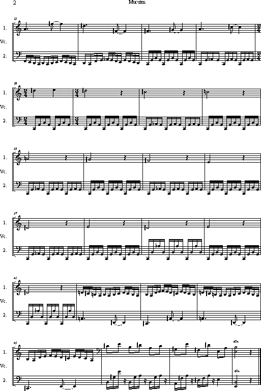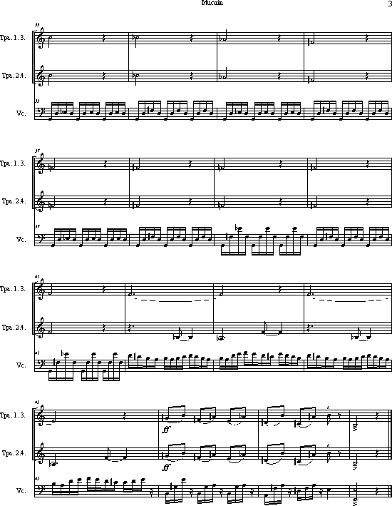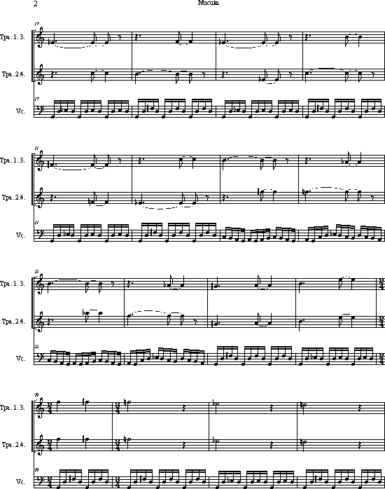 Após a observação das imagens, pôde-se perceber que, em ambos os casos, a idéia sugerida é a de que existe um nível de contraste presente em ambas as figuras. Então, foi feita opção pela superposição de duas idéias contrastantes, a seguir descritas (ressalte-se que a proposta não foi a de obter nível máximo de contraste e, sim, uma condição satisfatória que permita o entendimento do princípio). Na organização das alturas, foi adotado um critério de escolha baseado na complementaridade de conjuntos: as notas utilizadas no acompanhamento executado em semicolcheias consistem em um subconjunto complementar do conjunto utilizado na melodia. No aspecto rítmico, foi utilizada uma polirritmia obtida por meio da superposição das figuras semínima pontuada - unidades de maior duração (melodia) - e semicolcheias - unidades de menor duração (acompanhamento) - organizadas dentro de um compasso ternário. No aspecto tímbrico, existe um distanciamento entre os registros que constituem esses dois planos. Ao se observar a primeira versão, pode-se intuir que motivos contrastantes, se forem tocados pelo mesmo timbre, podem constituir uma unidade, pois o timbre é o fator agregativo. Portanto, é possível afirmar que, apesar do contraste gerado, existe proximidade (simultaneidade e evolução dos eventos) e semelhança (timbre e conteúdo) no exemplo em comento. Já na segunda versão, a presença das trompas atribui um novo nível de contraste, no qual, apesar da proximidade, não existe semelhança (o timbre não constitui fator agregativo).