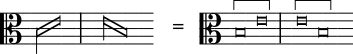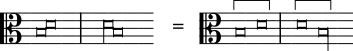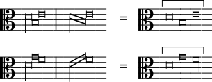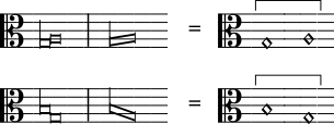 Se, por outro lado, a nota inicial tem uma linha para baixo no lado esquerdo, então ela conta como uma breve, seja a ligadura recta ou obliqua ou, se a nota seguinte for mais aguda ou mais grave:
