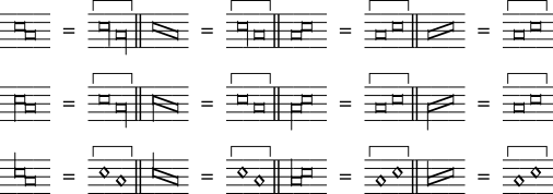 e ligaturae obliquae, onde elas são escritas com uma figura oblíqua e de modo que o início e o final da figura indique as duas notas da ligadura, por exemplo:
