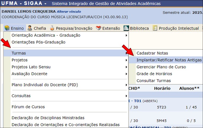3) No Menu "Ensino", clique em Turmas e depois em Implantar/Retificar Notas Antigas;
