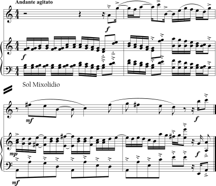 O Exemplo 5-12 ilustra o diatonicismo não funcional [*]. Embora a centralidade da passagem seja clara (Sol para os primeiros compassos e depois mudando para Lá), ela não é tradicionalmente tonal - tente analisá-la com numerais romanos! Ela usa, entretanto, somente coleções diatônicas. Essas coleções definem áreas harmônicas distintas. Nos primeiros compassos, somente as "teclas brancas" são usadas. No compasso 3, o Fá é substituído pelo Fá, resultando numa coleção diatônica diferente, uma transposição da primeira. Quando o centro de nota e a coleção mudam, assim também o faz o ordenamento modal: de Sol Mixolídio para Lá Dório. Essas mudanças - na centralidade, coleção e ordenamento modal - transmitem o senso de uma mudança em grande escala de uma área harmônica para outra.