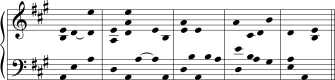 No início do Concerto em Ré de Stravinsky (Exemplo 5-3), encontra-se a presença de três tríades: Ré maior, Ré menor e Si menor, nenhuma das quais é estabelecida inequivocamente; mais ainda, elas permanecem numa confrontação tensa e estática umas com as outras.