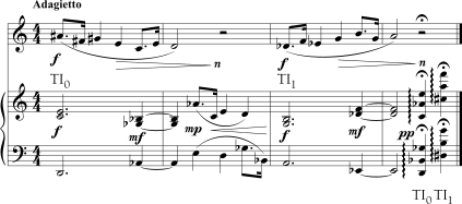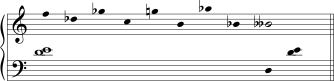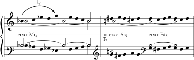 O mesmo é verdade para o Exemplo 5-11a, mas de modo bem mais complicado. O motivo cromático de sete notas do início é simétrico em torno de sua primeira nota e sobe um semitom do início ao fim. A primeira apresentação (no compasso 2, repetida uma oitava mais aguda no compasso 3) é simétrica em torno de Fá enquanto a segunda apresentação (compasso 5) é simétrica em torno de Dó. Estas compartilham o mesmo eixo de simetria: 0—6. As duas entradas sobrepostas do motivo nos compassos 8-9 são simétricas em Sol e depois em Ré. Estas compartilham um eixo de simetria diferente: 1—7. Pode-se dizer que o eixo de simetria se deslocou um semitom acima, assim como o gesto melódico inicial envolvendo o movimento ascendente de um semitom (Exemplo 5-11b). (Seria igualmente acurado, mas menos interessante motivicamente, dizer que o eixo se deslocou sete semitons acima.)