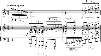 Assim como as coleções octatônicas e tons-inteiros, a coleção hexatônica, cc(014589) (nome de Forte = 6-20), ocorre frequentemente na música pós-tonal e tem muitas propriedades impressionantes. Ela é simétrica tanto transpoitiva quanto inversivamente em três níveis diferentes. Como resultado, há somente quatro membros distintos desta classe de conjuntos, identificados pelo semitom de classe de notas numericamente mais grave que as define exclusivamente (ver o Exemplo 5-20).
