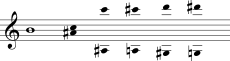 A simetria inversiva pode ser realizada no espaço de classes de notas em vez de no espaço de notas. A passagem no Exemplo 5-7a [*] começa com a díade Dó-Ré e expande-se numa cunha simétrica. Quando a cunha alcança Sol-Fá, ambas as notas são duplicadas à oitava. Finalmente, a díade original Dó-Ré retorna, mas numa oitava diferente de sua primeira afirmação. Devido aos deslocamentos de oitava, é mais fácil entender a simetria inversiva com um mostrador de relógio de classes de notas (Exemplo 5-7b). Em tal mostrador o eixo de simetria consiste de duas notas (ou dois pares de notas) separadas por trítono - estas são os polos do eixo. Neste caso, o eixo é Dó/Ré—Fá/Sol.