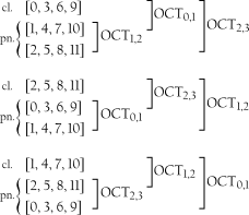 A coleção octatônica é outra favorita pós-tonal, notavelmente na música de Bartók, Stravinsky e Messiaen. Essa coleção, cc(0134679A) (nome de Forte = 8-28), tem muitas características distintivas. Primeira, ela pé altamente simétrica, tanto transpositiva quanto inversivamente. Ela se mapeia em si mesma em quatro níveis de transposição e quatro níveis de inversão. Como resultado, ela tem somente três formas distintas (assim como o seu complemento, o acorde de sétima diminuta). O Exemplo 5-15 mostra as três coleções octatônicas e as identifica com o semitom de classes de notas mais grave que elas contêm. Assim, OCT0,1 é a coleção octatônica que contém Dó e Dó; OCT1,2 contém Dó e Ré; e OCT2,3 contém Ré e Mi.