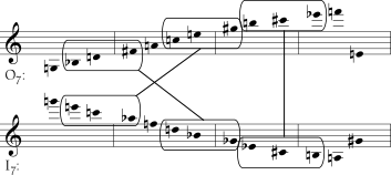 Para um tipo diferente de invariância sob inversão considere-se o que acontce quando uma série soa nota contra nota com uma forma inversivamente relacionada. Usar-se-á a série de Piano Variations, op. 27 de Webern como exemplo, embora a relação discutida seja verdadeira para qualquer par de séries relacionadas por inversão. O Exemplo 6-20 mostra O8 soando nota contra nota com I10.