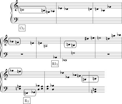 A série começa com a díade (0, 11). Se se quer manter 0 e 11 próximos um do outro enquanto se transforma a série, querer-se-á selecionar uma transformação que mapeará 0 e 11 neles mesmos ou em qualquer outra díade de semitom da série. Tenta-se [por exemplo] mapeá-la em (6, 5) (poder-se-ia facilmente escolher mapeá-la em qualquer dos outros semitons da série). Seria fácil fazer isso sob transposição, mas também é possível sob inversão. Procura-se pelo número de índice de [11, 0] e [5, 6]. O número de índice é 5 )0 + 5 = 6 + 11). I5 portanto, mapeará 0 e 11 em 6 e 5 (e vice-versa). Compare-se O0 com I5 (ver o Exemplo 6-16).