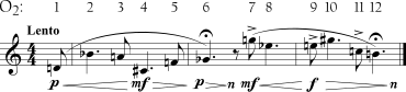 Designa-se aquela forma da série de O porque ela é proeminente e fácil de seguir. Observe-se o procedimento comum de contagem das doze para identificar a posição de ordem que cada nota ocupa na forma da série (Ré é a primeira, Si é a segunda e assim por diante).