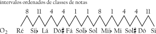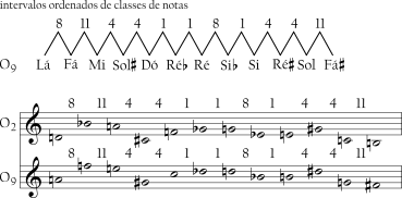 Agora o problema é identificar as formas da série usadas no acompanhamento. Pode-se construir uma matriz 12 x 12, procurar as primeiras notas do acompanhamento (Fá, Mi, Lá, Dó) e ver qual das quarenta e oito formas começa assim. Mas também se pode encontrar a resposta mais diretamente aplicando o conhecimento das relaçoes intervalares entre as formas da série. Observe-se a sucessão de intervalos ordenados de classes de notas descrita por O2 (Exemplo 6-8).