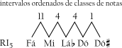 Os subconjuntos em questão podem ser tão pequenos quanto uma díade. No Exemplo 6-15 vê-se a série familiar do Quarteto de Cordas No. 4 de Schoenberg, escrita em inteiros de classes de notas e transposta para começar em Dó.