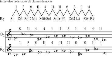 Assim como com as outras ordenações (retrógrada, inversa e retroinversa), pode-se pensar nelas em termos de seu efeito sobre as classes de notas ou o seu efeito sobre os intervalos. Em termos de de classes de notas, a retrógrada simplesmente reverte a ordem original. O que acontece com a sucessão de intervalos quando O2 é tocada de trás para a frente (uma ordem chamada R2)? O Exemplo 6-4 demonstra.