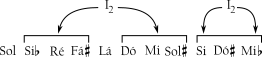 A invertida da série envolve a inversão de cada uma das classes de notas da série: ) inverte-se em 0, 1 inverte-se em 11, 2 inverte-se em 10, 3 inverte-se em 9 e assim por diante. O Exemplo 6-5 mostra a sucessão de intervalos para I7, a ordem invertida que começa com a classe de notas 7. (observe-se que se está usando agora In como o nome para a série, ao passo que previamente se o usava somente como uma operação para conectar dois conjuntos. Estes significados diferentes, mas relacionados, normalmente ficam claros pelo contexto.)
