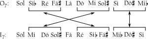 Ao se transpor uma das duas séries acima, pode-se ainda manter aquelas díades de classes de notas invariantes desde que se mantenha o número de índice. Por exemplo, ao se transpor O8 cinco semitons mais agudo para O1, precisa transpor I19 cinco semitons mais grave para I5 para manter o número de índice como 6 (Exemplo 6-18).